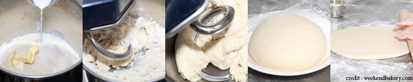 เจ้าของสูตรมักจะทำแป้งโดว์ครัวซองต์ในช่วงเย็น โดยการผสมส่วนผสมของแป้งโดว์ครัวซองต์ ลงในโถผสมแป้ง และนวดเป็นเวลา 3 นาทีด้วยความเร็วต่ำถึงปานกลางจนแป้งเข้ากัน (นวดให้เนียนจนส่วนผสมไม่ติดโถ ตรงนี้ต้องนวดแป้งให้เนียนพอดีจริงๆ นะคะ หลายคนนวดน้อยไป แป้งไม่เนียน เนยรั่วได้ค่ะ) ให้แป้งเกิดกลูเตนเล็กน้อยถึงปานกลาง เนื่องจากเราไม่ต้องการให้โดว์มีกลูเตนเกิดขึ้นมากเกินไป ไม่งั้นแป้งจะเหนียว เกิดแรงต้านในขั้นตอนเข้าเนย ทำให้รีดยากค่ะ (เพิ่มเติมจากผู้แปล – นี่เป็นอีกเหตุผลที่ฝรั่งใช้แป้ง T55 ไม่ใช้แป้งขนมปังในการทำครัวซองต์ค่ะ เนื่องจากครัวซองต์ไม่ได้ต้องการกลูเตนแบบขนมปัง แต่ก็ต้องการผิวที่เรียบเนียนค่ะ) จากนั้นรีดให้เป็นแผ่นแบนๆ เหมือแผ่นซีดี เหตุผลที่ไม่ขึ้นรูปเป็นแบบก้อนกลมๆ แบบขนมปัง เพราะวันพรุ่งนี้เราจะได้ตัดแป้งเป็นสี่เหลี่ยมได้ง่ายขึ้นค่ะ ก่อนนำไปแช่เย็นให้คลุมด้วย wrap ก่อนนะคะ จากนั้นทิ้งข้ามคืนไว้ในตู้เย็นค่ะ