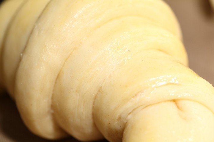 ขั้นตอนต่อไปให้ม้วนปลายทั้งสองข้างของด้านฐานของสามเลี่ยม โดยขยับมือ ม้วนแป้งออกจากกึ่งกลางที่ทำรอยบากไว้ วิธีนี้จะทำให้ได้ครัวซองต์ที่มีรูปทรงที่ยาวและบาง ไม่ใช่ทรงที่ตัวอ้วนสั้นนะคะ ตอนเริ่มม้วนปลายสามเหลี่ยม ให้ใช้แรงกดแป้งเล็กน้อยเพื่อให้แต่ละชั้นติดกัน (แต่ไม่กดแรงจนชั้นแป้งเสียหายนะคะ) พอม้วนไปช่วงกึ่งกลางก็ไม่ต้องใช้แรงกด ใช้แรงกลิ้งแทนค่ะ