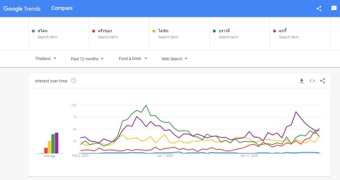 โควิด 19 ทำให้ใครหลายๆ คนผันตัวมาเป็นเชฟ ทั้งเชฟขนมหวาน เชฟของคาว เชฟหม้อทอดไร้น้ำมัน หรือบางคนอาจจะทำขนมเป็นอาชีพไปแล้ว วันนี้เล็มมีได้รวบรวมข้อมูลการค้นหา keyword บน google โดยใช้เครื่องมือที่เรียกว่า Google Trend เพื่อสำรวจเทรนด์ย้อนหลัง 1 ปี ว่าเราค้นหาขนมอะไรบ้าง แล้ว Data เหล่านี้จะช่วยทำนายได้หรือไม่ ว่าอะไรคือขนมตัวต่อไปที่กำลังจะมาแรง
