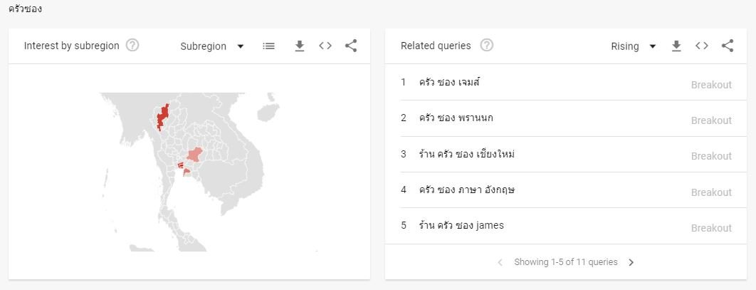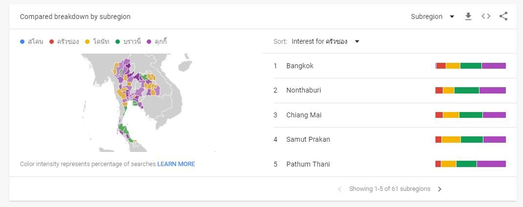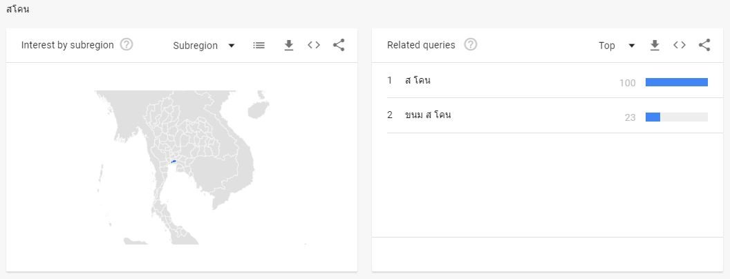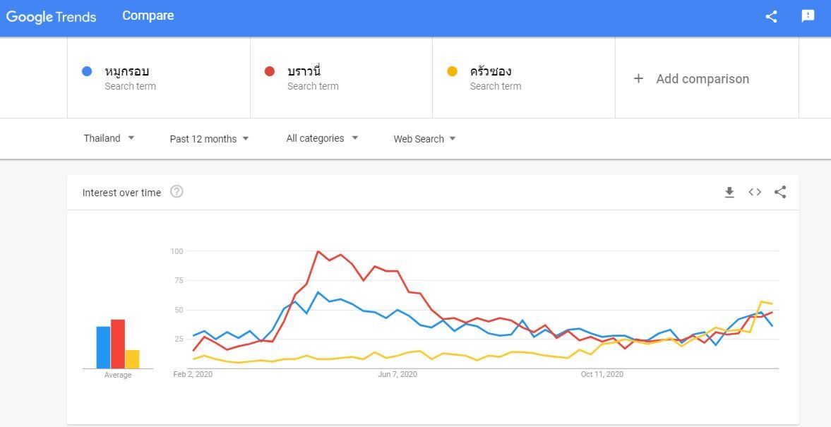 และสุดท้าย เพื่อเป็นการเปรียบเทียบเทรนด์ของขนม กับเทรนด์อาหาร เราเลยหยิบยกคำว่า หมูกรอบ มาเปรียบเทียบกับบราวนี่ และครัวซองต์ค่ะ โดยเราไม่ได้ระบุว่าให้ค้นหาในหมวดหมู่ Food & Drink แต่ให้ค้นหาในทุกๆ catagories ซึ่งในช่วงโควิด ถึงแม้จะเป็นเทรนด์หม้อทอดเหมือนกัน แต่บราวนี่ชนะขาดลอยค่ะ แต่พอมาดูในรายละเอียดคำค้นหา ชาวหมูกรอบก็มี keyword ที่น่ารัก อย่างสมาคมกระเพราหมูกรอบแห่งประเทศไทย ขึ้นมาเป็นเทรนด์ในช่วงที่หม้อทอดเริ่มซาลงไป ส่วนชาวบราวนี่ เมื่อดูในรายละเอียดคำค้นหา เราพบว่านอกจากการค้นหาสูตรแล้ว ธุรกิจบราวนี่ได้ถูกต่อยอดไปเป็นธุรกิจแบบมีแม่ข่าย ลูกข่ายไปแล้วค่ะ ไม่ต้องทำบราวนี่เองก็รวยได้ นี่อาจจะเป็นอีกหนึ่งเหตุผลที่ทำให้ทำไมการค้นหาคำว่าบราวนี่ ยังคงเป็นเทรนด์อยู่นั่นเองค่ะ